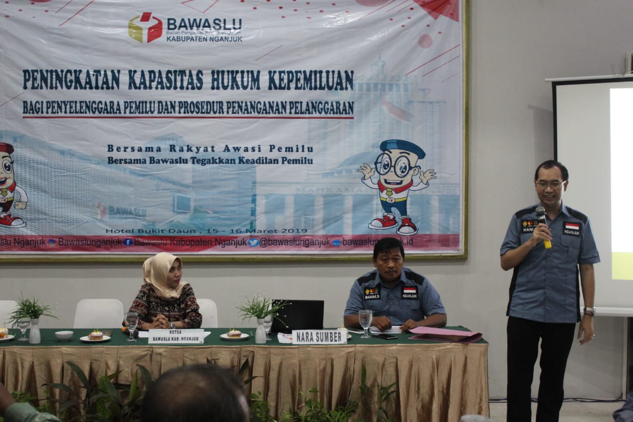 Nganjuk, Anggota Panitia Pengawas Pemilu Kecamatan (Panwascam) dan perwakilan Panitia Pemilihan Kecamatan (PPK) Se-Kabupaten Nganjuk hadiri acara Peningkatan Kapasitas Hukum Kepemiluan Bagi Penyelenggara Pemilu Dan Prosedur Penanganan Pelanggaran yang digelar Bawaslu Kabupaten Nganjuk di Hotel Bukit Daun Kediri pada tanggal 15-16 Maret 2019. Kegiatan yang berlangsung selama dua hari ini menghadirkan narasumber Iptu Imam Susanto, SH dari pihak Kepolisian dan Sri Hani Susilo, SH dari Kejaksaan Negeri Nganjuk.