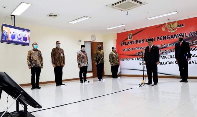 Ketua Bawaslu Abhan melantik enam pimpinan Bawaslu daerah secara daring. Foto :Humas Bawaslu RI
