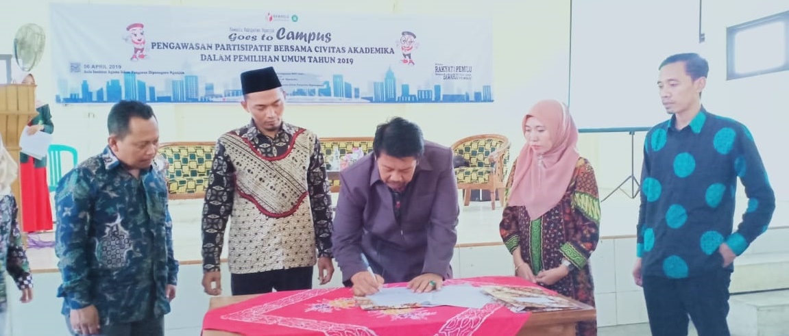 Nganjuk, Bawaslu Kabupaten Nganjuk lakukan Nota Kesepahaaman atau Memorandum of Understanding (MoU) dengan Institut Agama Islam Pangeran Diponegoro Nganjuk tentang Pendidikan, Pelatihan, Penelitian, Pengabdian dan Pemberdayaaan di Bidang Kepemiluan. MoU ini ditandatangani oleh Abdul Azis, S.Sos.I (Ketua Bawaslu Kabupaten Nganjuk) dan Dr. Sopingi, A.P.,MM. (Wakil Rektor III IAI Pangeran Diponegoro Nganjuk) yang dilakukan di Aula IAI Pangeran Diponegoro Nganjuk yang bertujuan untuk mengajak mahasiswa terlibat dalam pengawasan pemilu, Sabtu (06/04/2019).
