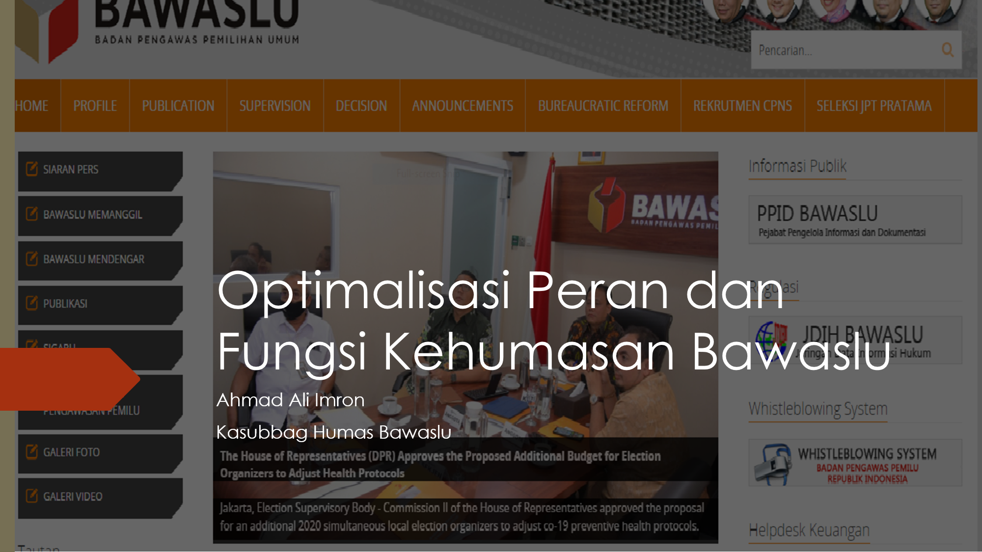 Hengky Pramono Kabag Humas dan AL Bawaslu RI. Beliau memaparkan tentang Revitalisasi Peran & Fungsi Humas Bawaslu. Bagaimana kiat-kiat seorang Humas Bawaslu dalam menyikapi Pilkada 2020 ditengah pandemi covid-19.