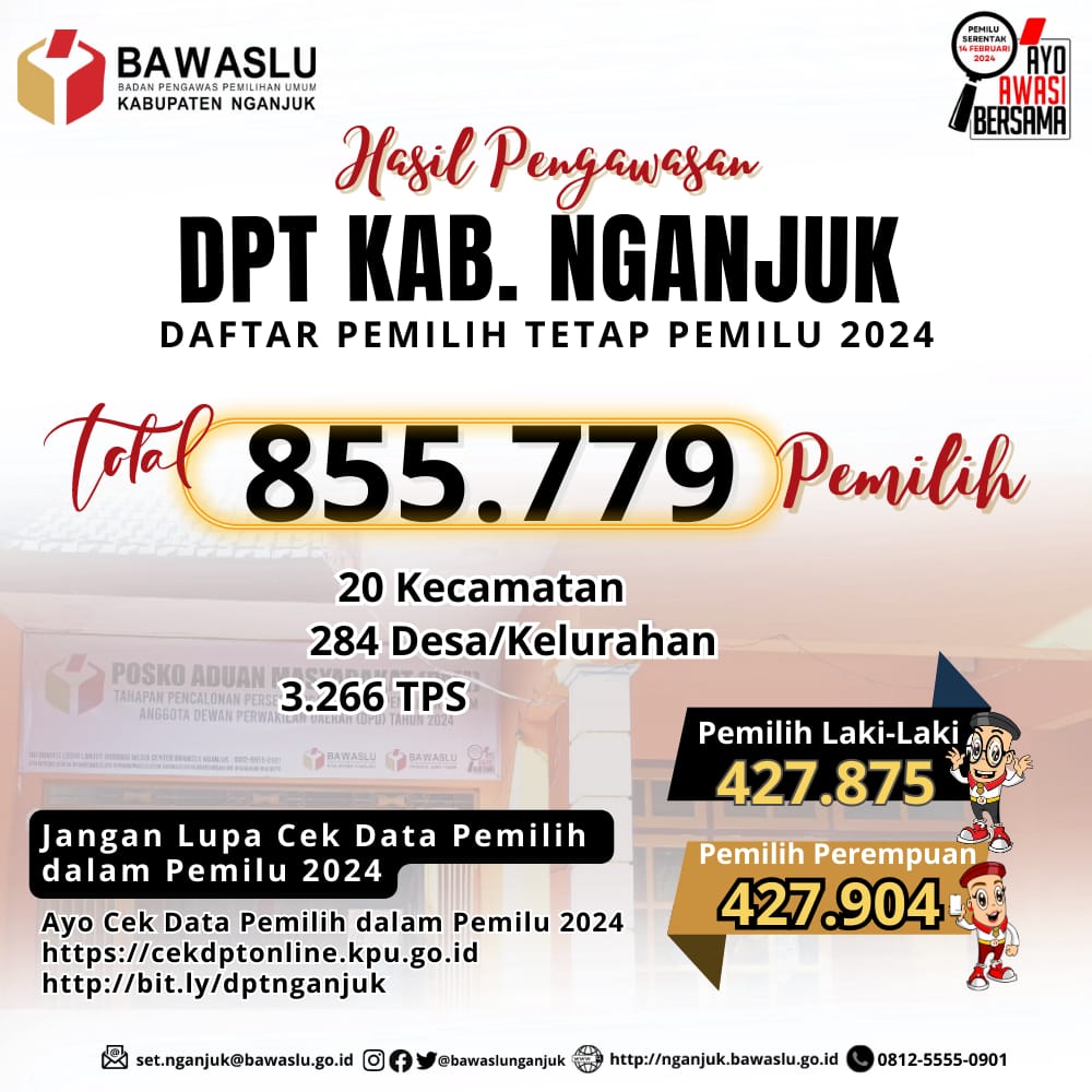 nganjuk.bawaslu.go.id- Bawaslu Kabupaten Nganjuk melakukan pengawasan penetapan Daftar Pemilih Tetap (DPT) Pemilu 2024 yakni sebanyak 855.779 pemilih pada Pemilu 2024 di wilayah Kabupaten Nganjuk.