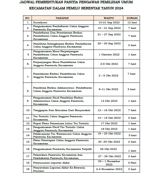 Keputusan tersebut di tetapkan di Jakarta pada tanggal 15 Oktober 2022 oleh Rahmat Bagja. Pada Keputusan tersebut menyatakan bahwa pada poin c Menimbang ; "sehubungan dengan perkembangan dan dinamika tahapan seleksi, sehingga diperlukan beberapa perubahan serta penyesuaian pada Pedoman Pelaksanaan Pembentukan Panitia Pengawas Pemilu Kecamatan".