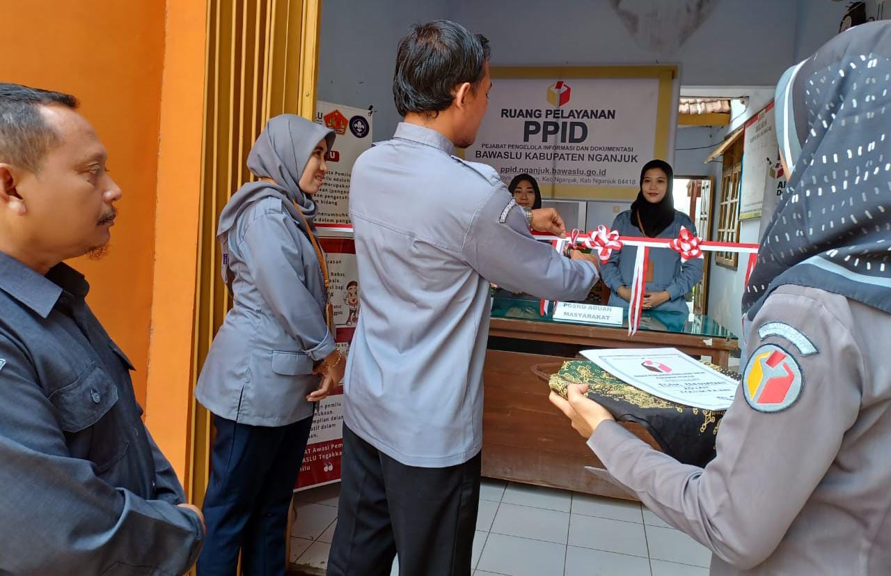 Abdul Azis selaku Ketua Bawaslu Kabupaten Nganjuk memotong pita merah putih dengan ini telah resmi "Posko Aduan Masyarakat" Dibuka. Dilanjutkan penyerahan form pernyataan aduan oleh Azis diberikan kepada petugas penerima laporan aduan.