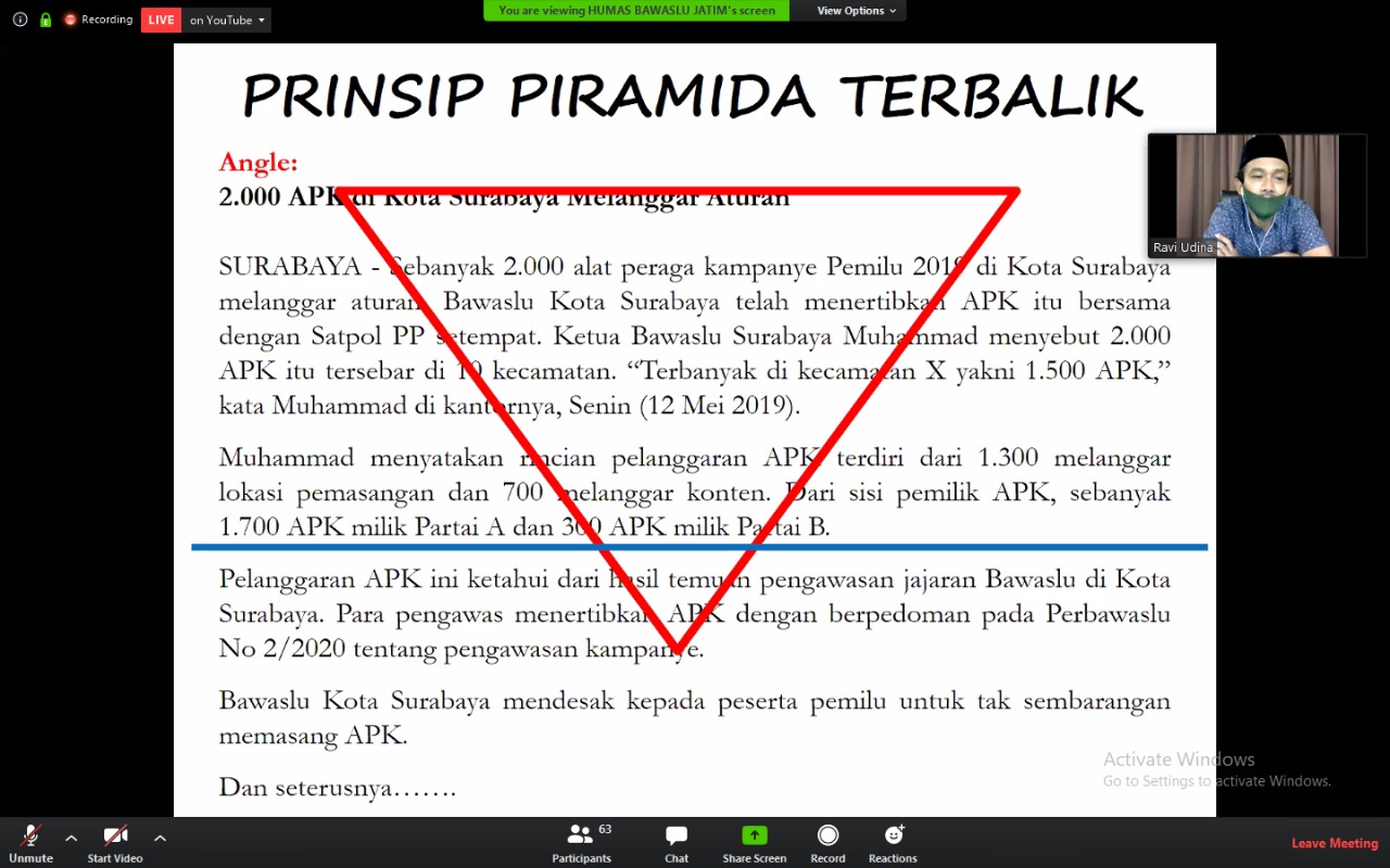 “Prinsip piramida terbalik, intinya adalah apa-apa yang penting, akan lebih baik diletakkan di bagian awal berita dan apa-apa yang sekiranya tidak penting diletakkan di akhir berita”, jelasnya.
