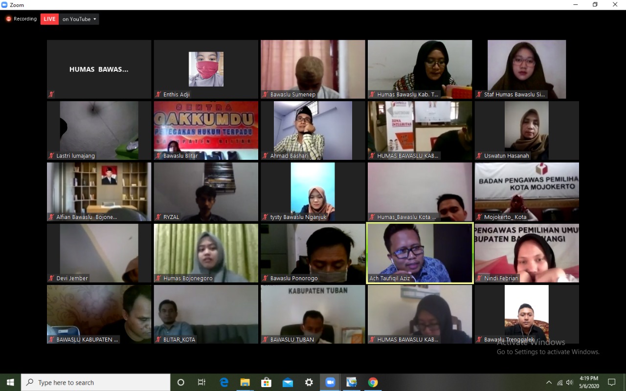 Nganjuk, nganjuk.bawaslu.go.id- Untuk kedua kalinya Bawaslu Provinsi Jawa Timur melaksanakan kegiatan Ngabuburit Online melalui aplikasi zoom, diikuti oleh Penanggung Jawab Kehumasan beserta Staf Humas Kabupaten / Kota Se-Jawa timur (6/5/2020).