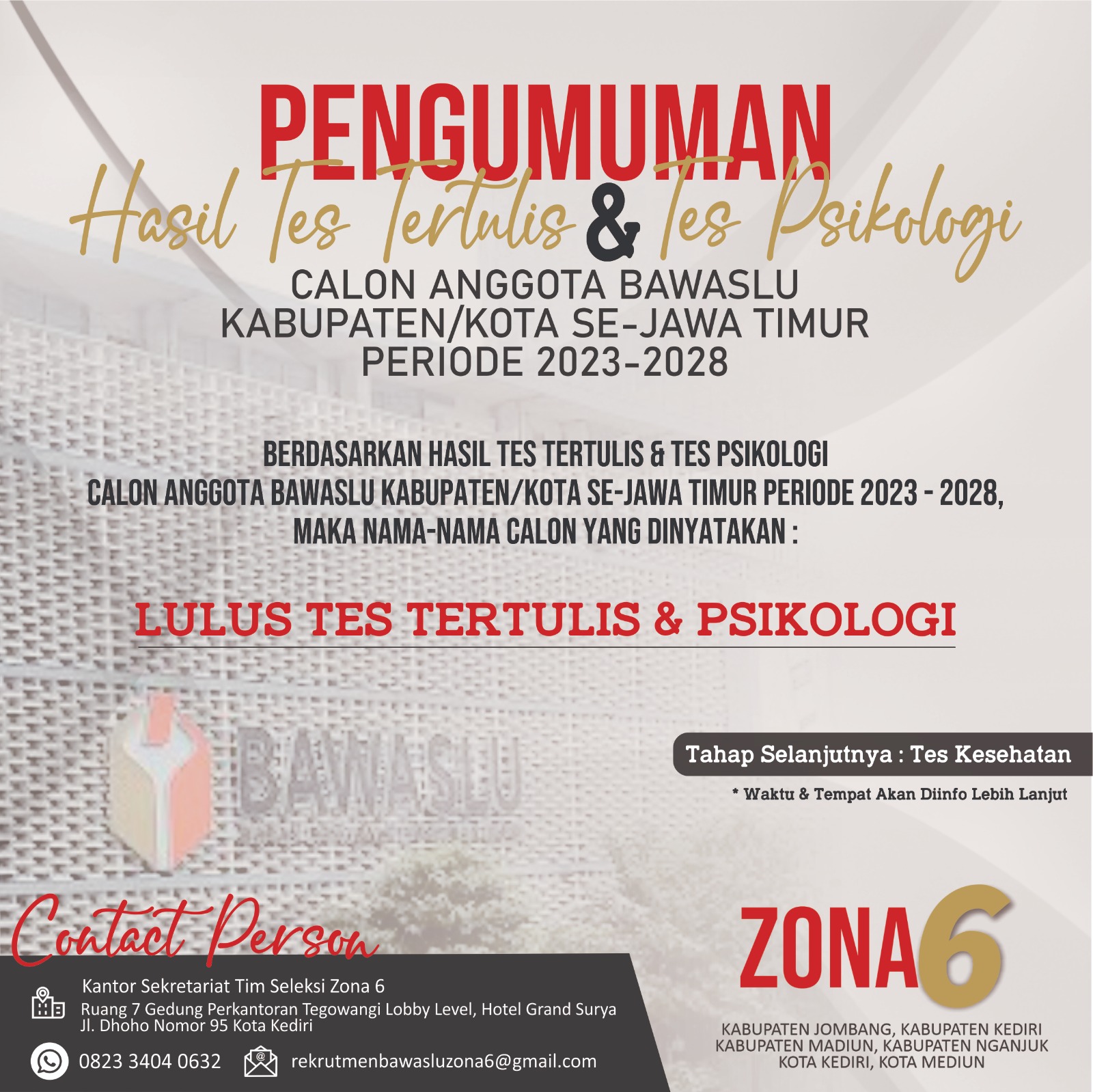 PENGUMUMAN HASIL TES TERTULIS DAN TES PSIKOLOGI SERTA WAKTU PELAKSANAAN TES KESEHATAN CALON BAWASLU KABUPATEN/KOTA ZONA 6