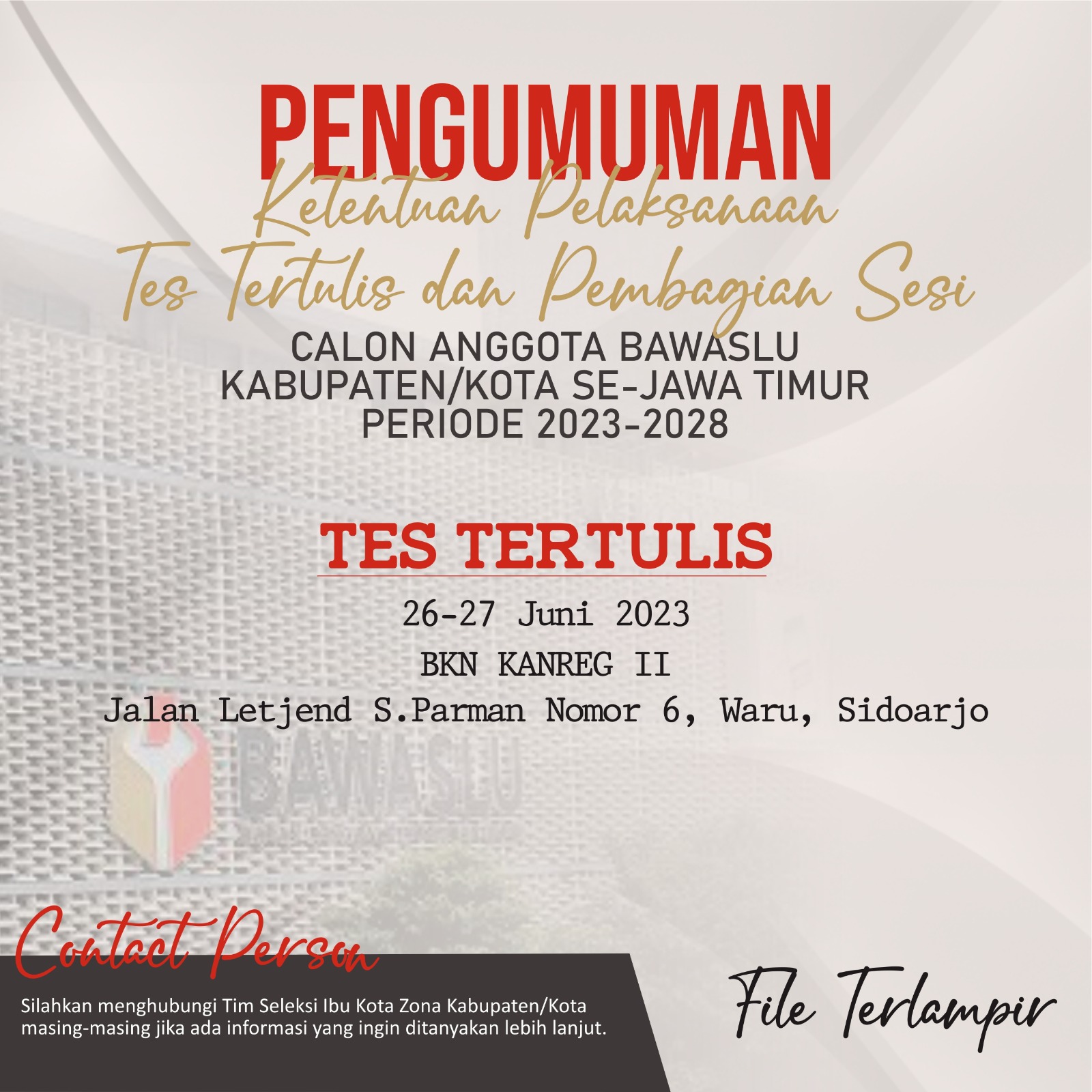 PENGUMUMAN KETENTUAN PELAKSANAAN TES TERTULIS DAN PEMBAGIAN SESI CALON ANGGOTA BAWASLU KABUPATEN/KOTA SE-JAWA TIMUR ZONA 1-7 MASA JABATAN 2023 – 2028