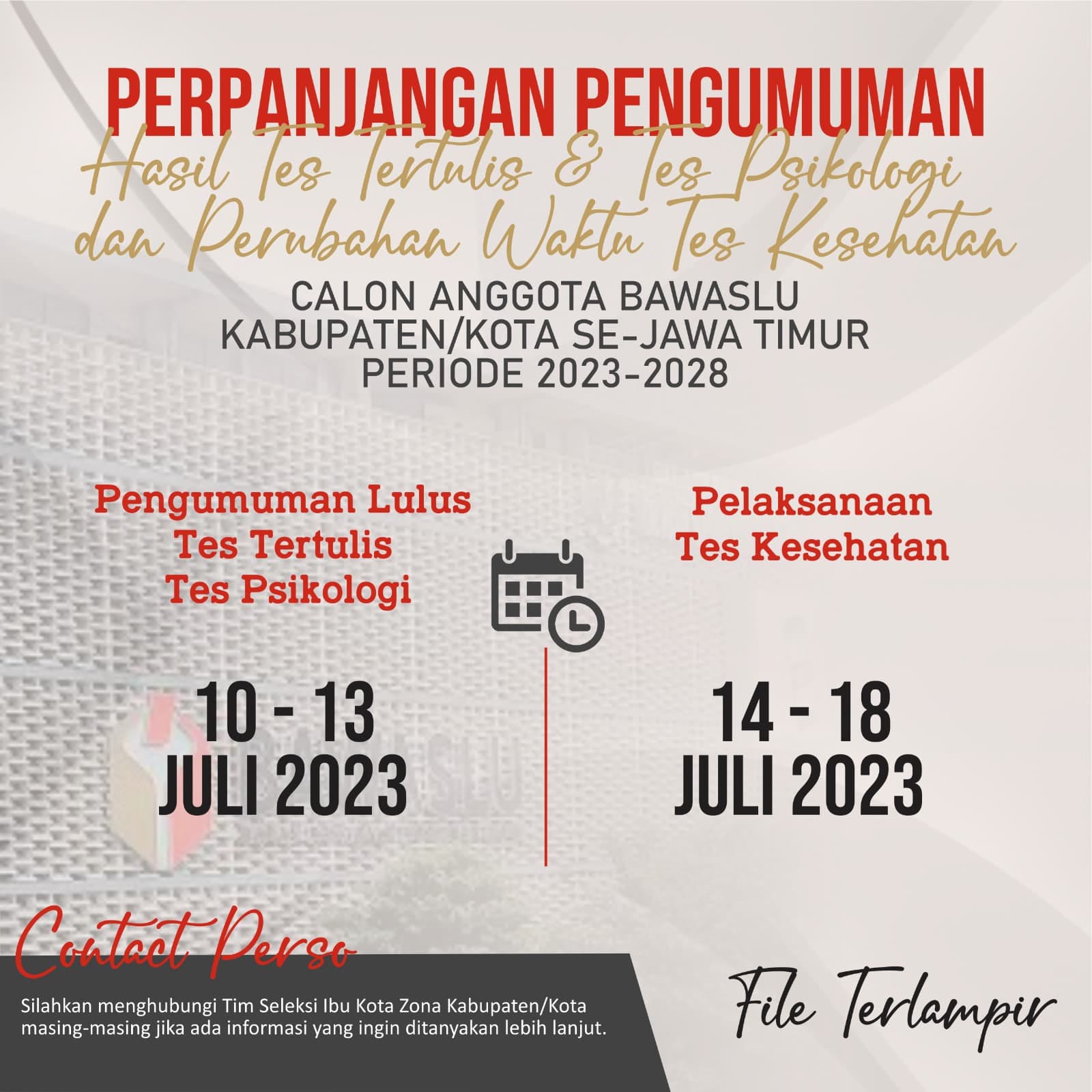 nganjuk.bawaslu.go.id- Sehubungan dengan adanya beberapa kendala teknis yang terjadi dalam proses memastikan data NIK peserta tes Calon Anggota Bawaslu Kabupaten/Kota baik yang mengikuti tes tertulis dan tes psikologi di seluruh Kabupaten/Kota se Indonesia, maka perpanjangan waktu Pengumuman Lulus Tes Tertulis dan Tes Psikologi dari yang semula: Senin, 10 Juli 2023 s.d. Selasa, 11 Juli 2023 menjadi Senin, 10 Juli 2023 s.d. Kamis, 13 Juli 2023.
