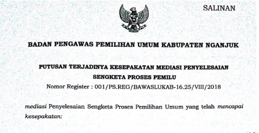 Putusan Terjadinya Kesepakatan Mediasi Penyelesaian Sengketa Proses Pemilu humas | Jumat, Agustus 31, 2018 - 10:49 Tag Penyelesaian Sengketa Putusan Share Berita Terkini humas Kamis, Januari 22, 2026 - 15:19 Bawaslu Nganjuk Sampaikan Catatan Strategis Evaluasi Program Kegiatan Divisi Pencegahan, Parmas dan Hubal humas Rabu, Januari 21, 2026 - 13:18 Bawaslu Kabupaten Nganjuk Gelar Rapat Pleno Rutin: Tingkatkan Kualitas Pengelolaan Anggaran dan Administrasi humas Selasa, Januari 13, 2026 - 15:47 Bawaslu Nganjuk Tingkatkan Pengelolaan Arsip dengan SRIKANDI Lewat “Ngopi Bareng” Lihat Lainnya