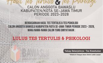 nganjuk.bawaslu.go.id- Dalam rangka melaksanakan amanat Undang-Undang Nomor 7 Tahun 2017 tentang Pemilihan Umum, setelah melakukan penilaian atas Tes Tertulis dan Tes Psikologi Calon Anggota Bawaslu Kabupaten/Kota Se-Jawa Timur Masa Jabatan 2023-2028, bersama ini kami umumkan nam