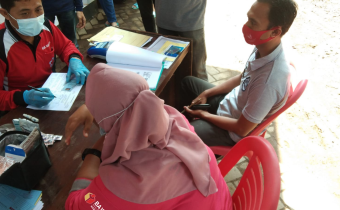Fathurrahman Anggota Bawaslu Nganjuk sedang dilakukan transfusi donor darah bersama warga yang dilakukan oleh tim PMI Nganjuk, (09/04/21).