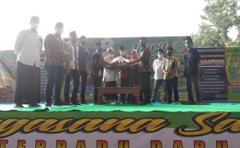 Penyerahan tumpeng oleh Bawaslu Kabupaten Nganjuk kepada pengasuh ponpes Daru Ulil Albab, Kamis(22/10/2020)