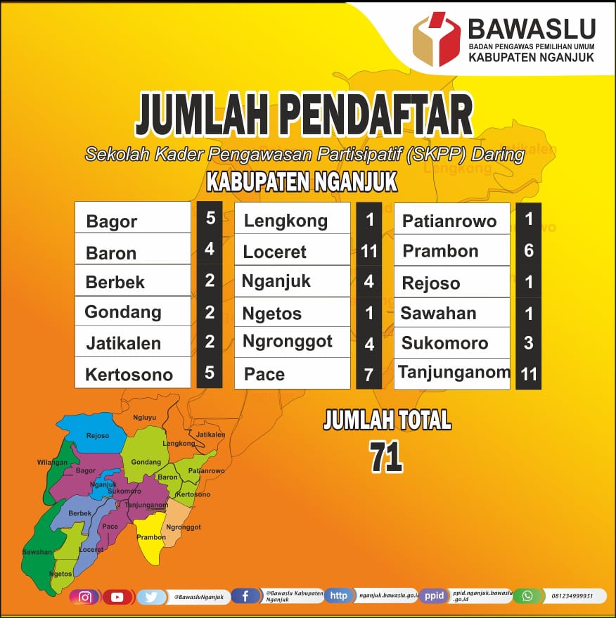 Nganjuk (Nganjuk.bawaslu.go.id) Selasa, (14/04/2020). Program Sekolah Kader Pengawasan Partisipatif (SKPP) Daring Bawaslu Republik Indonesia antusias diikuti oleh ribuan peserta, tercatat sebanyak 20.665 peserta se Indonesia, 2.568 peserta dari Jawa Timur, dan dari Kabupaten Nganjuk sendiri sebanyak 71 peserta turut ikut mendaftar SKPP daring.