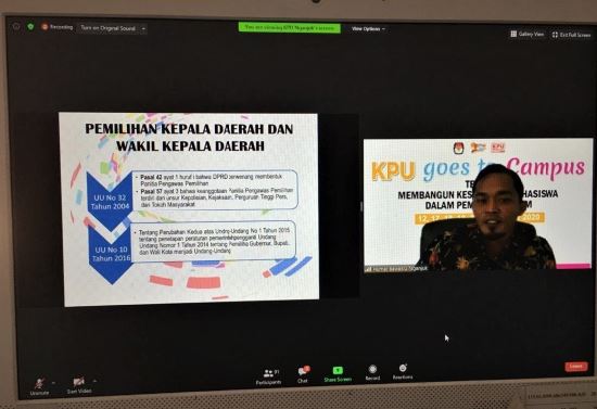 nganjuk.bawaslu.go.id ─ Abdul Azis selaku Ketua Bawaslu Kabupaten Nganjuk menjadi narasumber di Acara Zoom Meting yang diselenggarakan KPU dalam acara KPU GOES TO CAMPUS dengan Tema “Membangun Kesadaran Mahasiswa dalam Pemilihan Umum”, Hari Kamis 19 November 2020, Bersama Mahasiswa Kampus STIKIP PGRI Nganjuk. Kegiatan dimulai pada pukul 09.00 WIB.