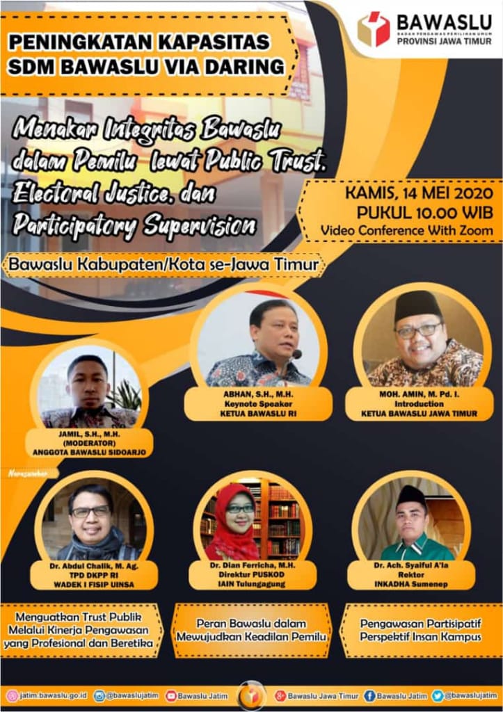 “Menjaga profesionalitas kerja khususnya pada Pengawas Pemilu dengan semaksimal mungkin menjaga kepercayaan masyarakat pada lembaga kita. Maka dihadirkan tiga kademisi untuk mengulasnya pada hari ini”, ungkap Amin. Tak hanya ketua dan anggota Bawaslu Kabupaten kota saja yang turut hadir berpartisipasi dalam acara daring tersebut, Bawaslu Provinsi juga turut menghadirkan Narasumber yang diantaranya Ach. Syaiful A’la Rektor dari Inkadha Sumenep, Dian Ferricha dari Direktur Puskod IAIN Tulungagung, dan Abdul Chalik dari TPD DKPP RI Wadek I Fisip Uinsa.(Nan/Ent)