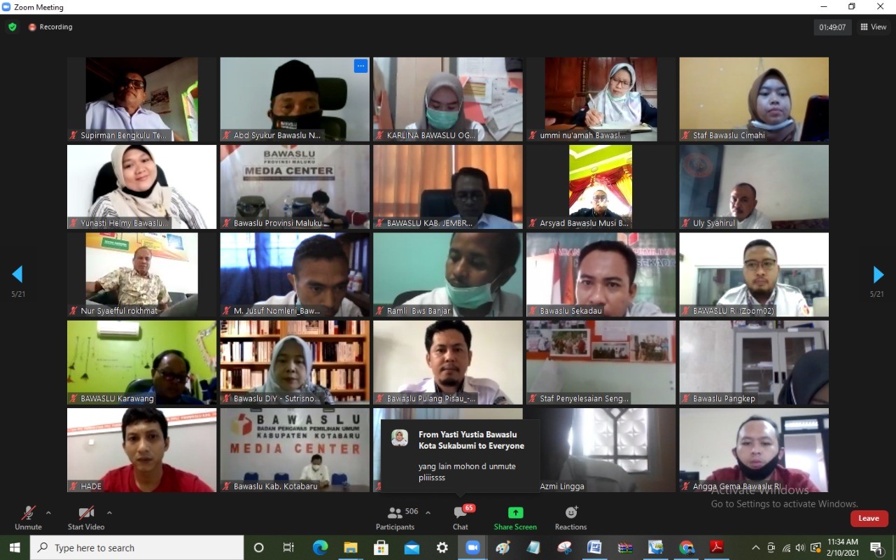 nganjuk.bawaslu.go.id – Bawaslu RI melaksanakan Rapat Koordinasi Nasional Daring diikuti oleh seluruh Koordinator Divisi Penyelesaian Sengketa Bawaslu Kabupaten/Kota se- Indonesia pada hari Rabu (10/02/21). Acara diawali sambutan oleh Rahmat Bagdja selaku Anggota Divisi Penyeleseaian Sengketa Bawaslu RI, dalam sambutanya beliau menyampaikan Salah satu fokus Bawaslu di masa yang akan datang ketika terjadi dugaan pelanggaran yang tergolong pelanggaran ringan dilakukan dengan sistim pendekatan secara kekeluargaan.