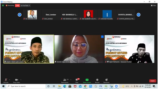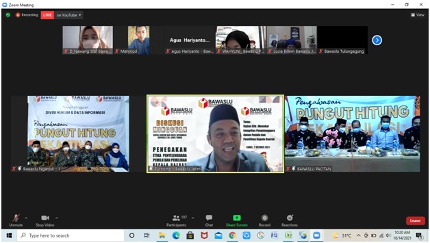 nganjuk.bawaslu.go.id- Divisi Hukum Bawaslu Provinsi Jawa Timur kembali mengadakan diskusi mingguan Bawaslu se-Jawa Timur yang dilaksanakan dalam beberapa sesi. Diskusi virtual ini dilaksanakan setiap hari Kamis yang dijadwalkan mulai dari bulan Juni 2021 dan berakhir di bulan Oktober 2021. Dalam Diskusi Mingguan seri ke 18 kali ini berkolaborasi dengan Bawaslu Kabupaten Nganjuk dan Bawaslu Kabupaten Pacitan, Kamis (14/10/2021).