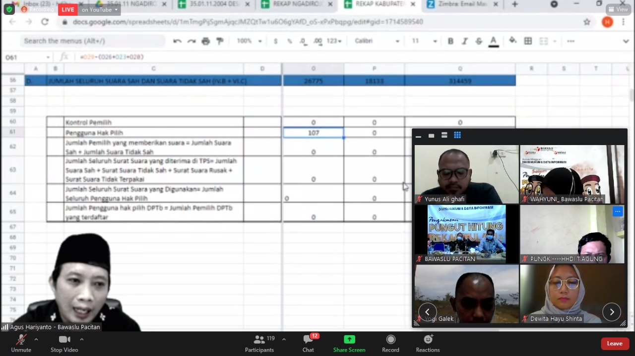 Sementara itu pemateri selanjutnya yaitu Agus Hariyanto, S.Pd.I menjelaskan bahwa ada alat baru khususnya di Pacitan yang digunakan untuk proses pegawasan pungut hitung pada pemilihan tahun 2020 yaitu e-Rekap. E-rekap yang di gunakan oleh Bawaslu Pacitan ini menggunakan google spreetsheet mengolah data C-hasil, cara kerjanya PKD di bantu oleh PTPS menginput kedalam sheet yang hanya bisa di akses oleh PKD, File yang di isi oleh PKD terakses secara online lalu dimodifikasi menggunakan koding dan dapat tekoneksi 1 kabupaten/kota, jadi pada hari H cukup PKD dan PTPS yang bekerja, Bawaslu Kab/Kota atau Panwascam bisa memonitor melalui komputer/hp di tempat masing-masing. Form E-rekap sama persis dengan C-hasil, bukan hanya data yang masuk tetapi sudah di lengkapi oleh control, sehingga kesalahan tulis/input bisa ketahuan.