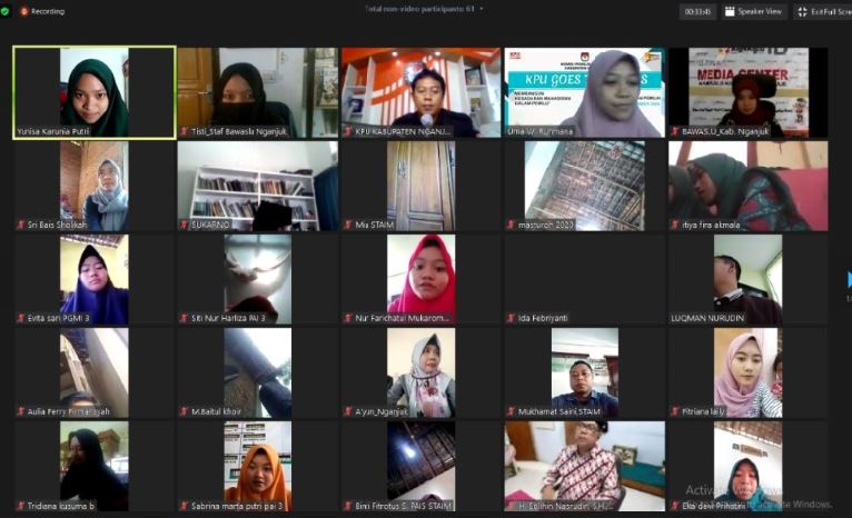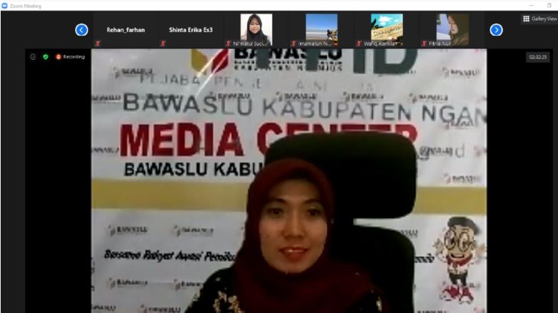 Nganjuk, nganjuk.bawaslu.go.id- Melalui media zoom, 12/11/2020 KPU melakukan kegiatan KPU goes to campus STAIM Nglawak Nganjuk dengan tema Membangun Kesadaran Mahasiswa Dalam Pemilihan Umum. Dalam kegiatan tersebut mengundang Bawaslu Nganjuk sebagai narasumber, Fina Lutfiana Rahmawati.
