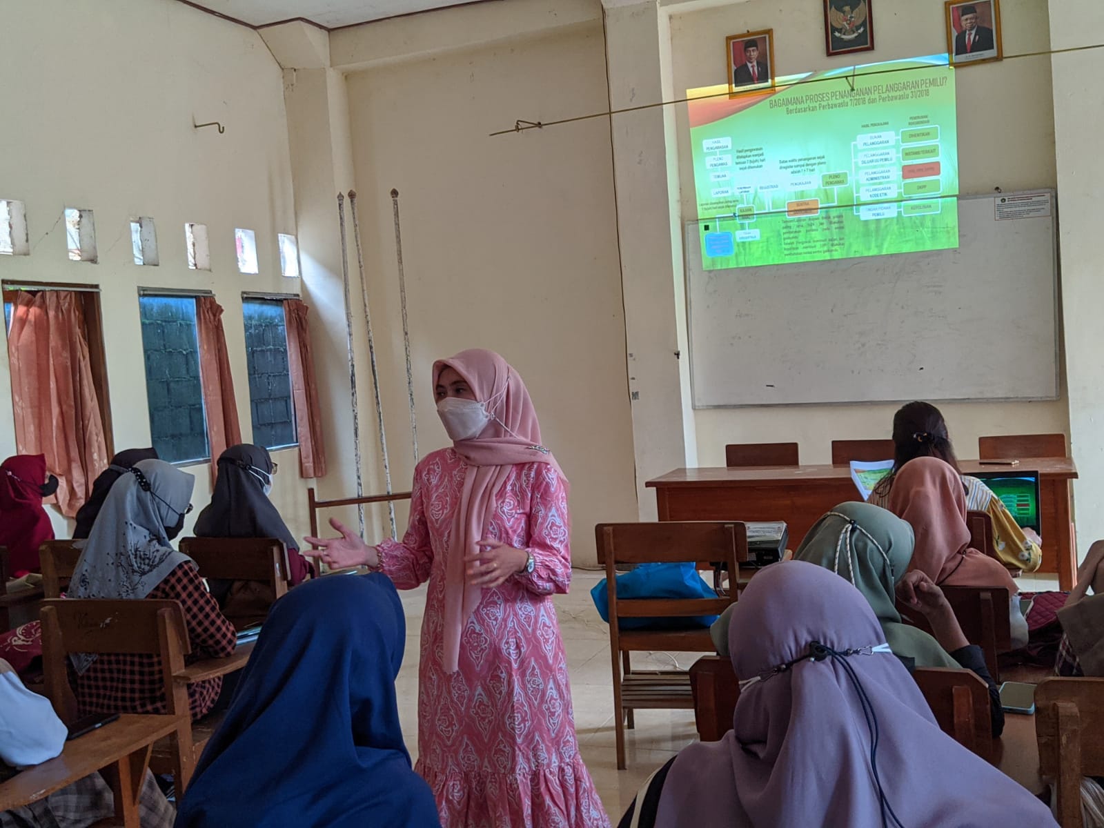 Fina Lutfiana Rahmawati, S.Pd.I,M.Pd selaku anggota Bawaslu Nganjuk sebagai dosen dalam pertemuan ketiga kuliah pengawasan partisipatif menyampaikan materi tentang Penanganan Pelanggaran Pemilu dan Pemilihan, materi yang disampaikan mencakup mengenai tujuan penindakan pelanggaran, jenis-jenis pelanggaran dalam pemilu dan pemilihan, bagaimana proses penanganan pelanggaran pemilu dan pemilihan, sampai dengan proses penyelesaian penanganan pelanggaran.