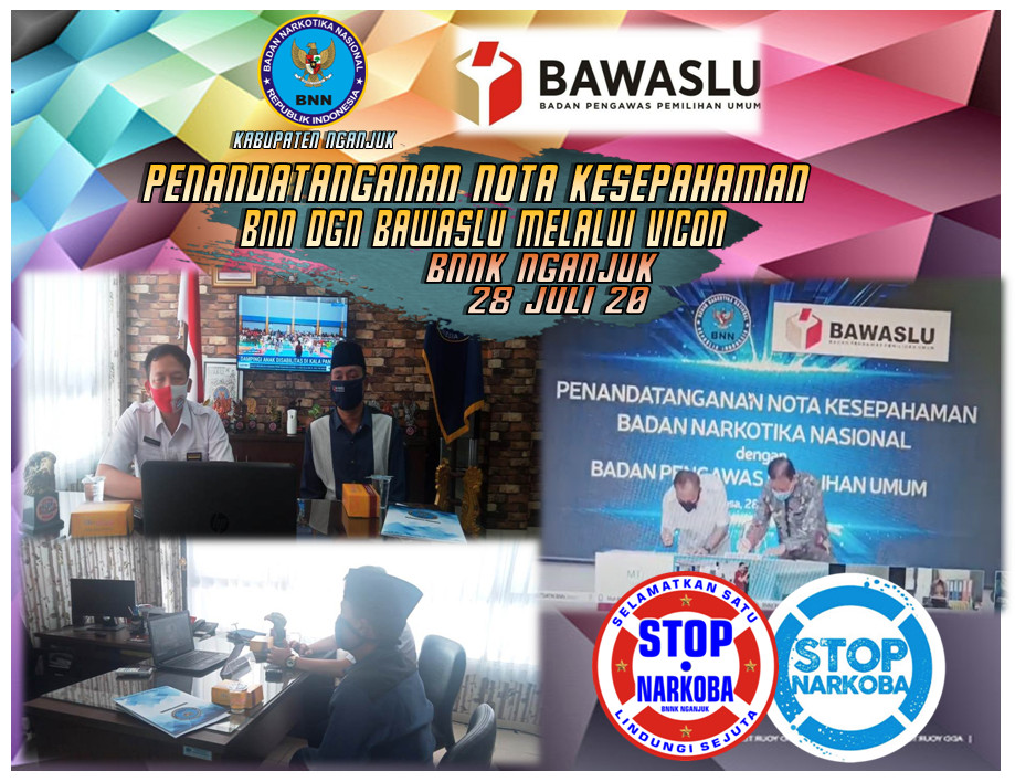 Nganjuk, nganjuk.bawaslu.go.id- Kegiatan Penandatanganan Nota Kesepahaman antara BNN dengan Badan Pengawas Pemilihan Umum serta penyampaian arahan dari Kepala BNN dan Ketua Bawaslu Melalu Video Conference.