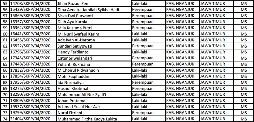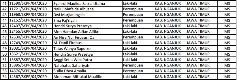 Berikut nama-nama 74 peserta yang lolos wilayah Kabupaten Nganjuk dalam seleksi peserta SKPP Daring yang diselenggarakan oleh Bawaslu RI.
