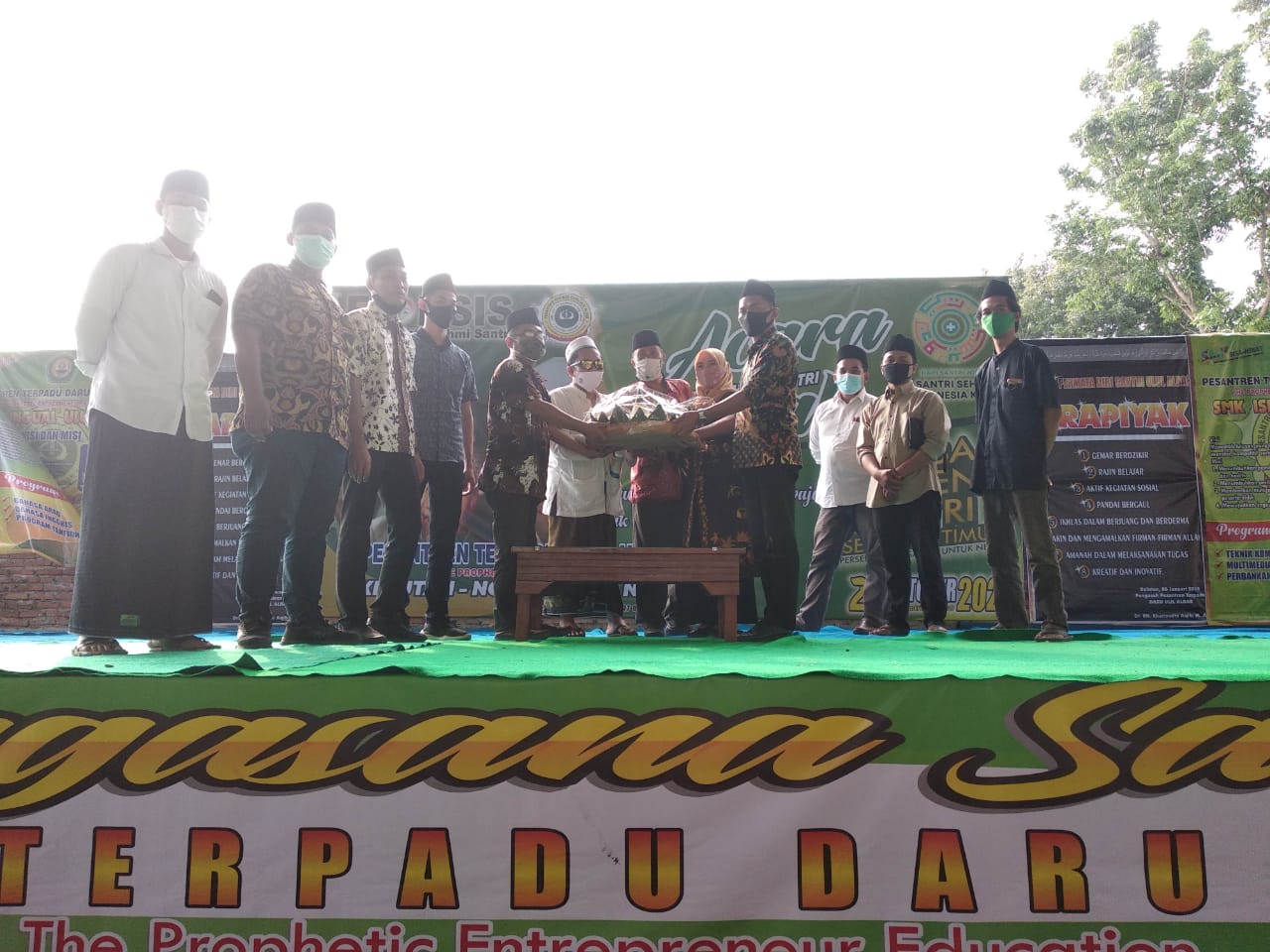 Penyerahan tumpeng oleh Bawaslu Kabupaten Nganjuk kepada pengasuh ponpes Daru Ulil Albab, Kamis(22/10/2020)
