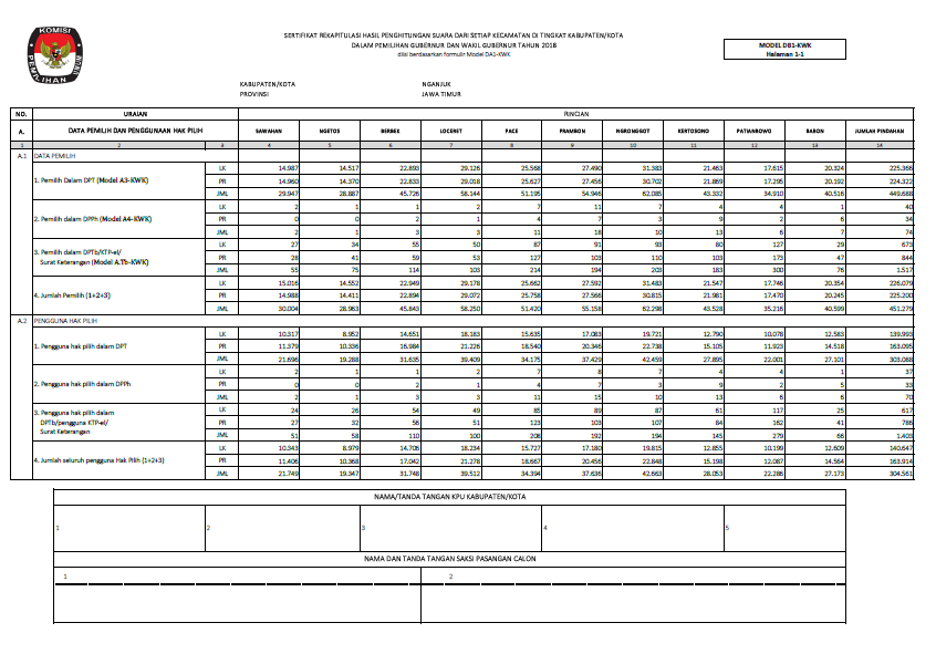 Sertifikat Rekapitulasi Hasil Penghitungan Suara Dari Setiap Kecamatan Di Tingkat Kabupaten/Kota Dalam Pemilihan Gubernur Dan Wakil Gubernur Tahun 2018 humas | Selasa, Januari 1, 2019 - 15:15 Tag Pilkada 2018 Share Berita Terkini humas Kamis, Januari 22, 2026 - 15:19 Bawaslu Nganjuk Sampaikan Catatan Strategis Evaluasi Program Kegiatan Divisi Pencegahan, Parmas dan Hubal humas Rabu, Januari 21, 2026 - 13:18 Bawaslu Kabupaten Nganjuk Gelar Rapat Pleno Rutin: Tingkatkan Kualitas Pengelolaan Anggaran dan Administrasi humas Selasa, Januari 13, 2026 - 15:47 Bawaslu Nganjuk Tingkatkan Pengelolaan Arsip dengan SRIKANDI Lewat “Ngopi Bareng” Lihat Lainnya